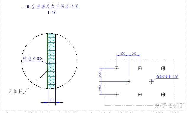 空預器外部采用硅酸鋁纖維氈進行保溫,并用保溫釘和鐵絲網與鋼板固定,外側彩鋼板,保溫層總厚度為100mm。