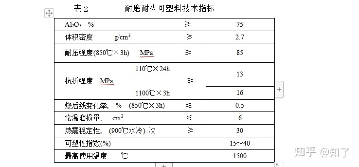 ⑶、材料采用耐磨耐火可塑料(表2)。