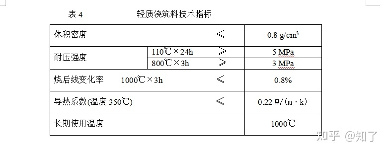 1.4.1 輕質澆注料的技術指標必須符合表4的要求。