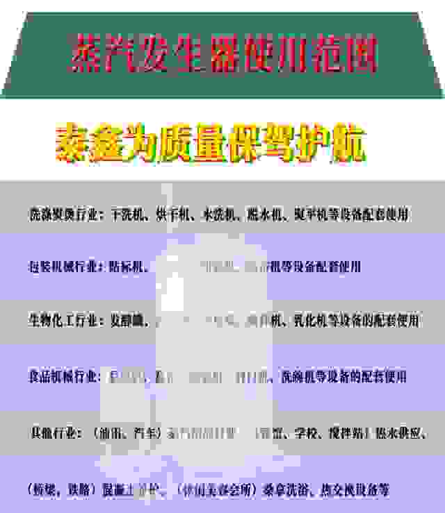 醫院,學校,紡織服裝行業,大型超市,酒店賓館,食堂餐廳,食品飲料行業,酒廠,制衣廠,印染廠,制藥廠,包裝廠,建材廠,涂料廠,飼料廠,塑料廠,橡膠,洗浴中心,小區居民樓取暖,實驗室,茶葉藥材烘干,其他