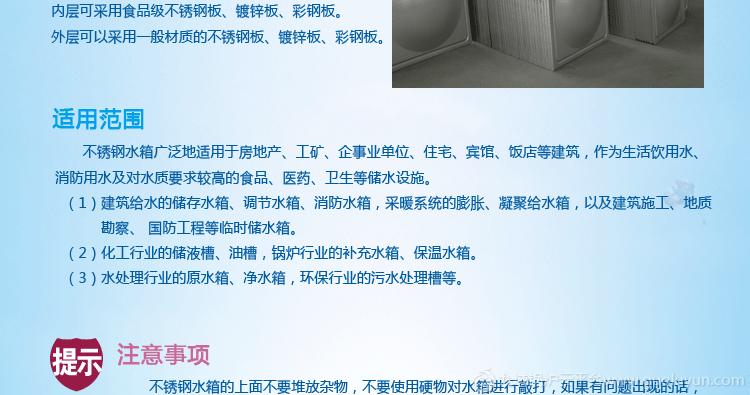 標準。不銹鋼水箱代替水泥水箱、鐵板水箱、玻璃鋼水箱是必然的趨勢,而且不銹鋼水箱衛生無毒、耐蝕性