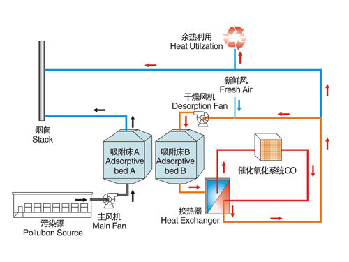 HCH工藝流程圖活性炭吸附+催化氧化(CO)技術采用活性炭吸附、熱氣流脫附和催化氧化三種組合工藝凈化有機廢氣,利用活性炭多微孔及巨大的表面張力等特性將廢氣中的有機溶劑吸附,使所排廢氣得到凈化為第一工作過程;活性炭吸附飽和后,按一定濃縮比把吸附在活性炭上的有機溶劑用熱氣流脫出并送往催化燃燒床為第二工作過程;進入催化燃燒床的高濃度有機廢氣經過進一點步加熱后,在催化劑的作用下氧氣分解,轉化成CO2和H2O,分解釋放出的熱量經高效換熱器回收后用于預熱進入催化燃燒床的高濃度有機廢氣為第三工作過程,上述三個工作過程在運行一定時間達到自平衡后,脫附、催化氧化分解過程無需外加能源加熱。根據有機廢氣VOCs的排放量,可采用兩個以上的吸附床交替切換吸附使用。如此以來多臺吸附床切換運行可實現大風量的連續性凈化工作。