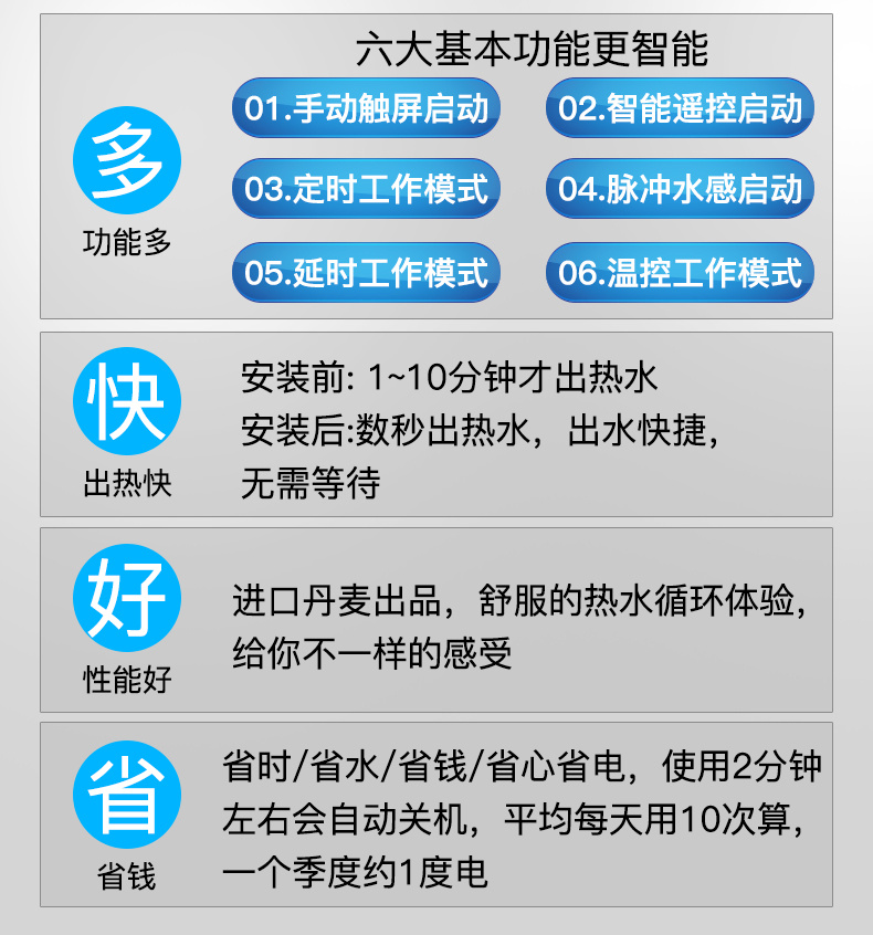 三、回水器的工作原理回水器就是強行在我們不用水的時候,讓水流動起來。冷掉的水被強行泵回了熱水器里,欺騙燃氣熱水器開機,或者直接摻到電熱水器的水箱里。在這個過程中,保證熱水管里始終有有熱水。這樣一來自然一開水龍頭馬上就有熱水用了。因此,回水器的核心部件是水泵。