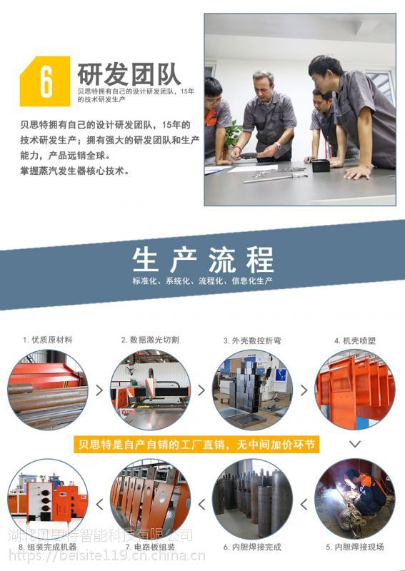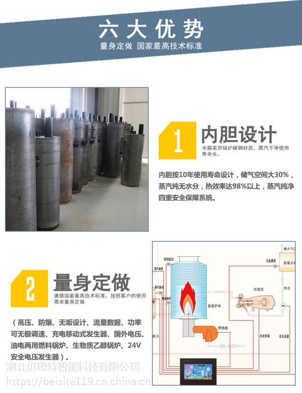 湖北貝思特智能科技有限公司坐落于素有“鄂東明珠”之稱的湖北黃岡,公司致力于電蒸汽發生器、燃油、燃氣蒸汽發生器、生物質蒸汽發生器、壓力容器、鍋爐及配件的研發、生產、銷售。先后自主研發了全自動電加熱蒸汽發生器、電循環熱水傳熱機組、化工反應釜、全自動燃氣蒸汽鍋爐、全自動燃油蒸汽鍋爐、環保型生物質顆粒鍋爐、高溫高壓蒸汽清洗設備、高溫高壓蒸汽醫療消毒制藥設備等十多個系列的二百多種產品,近期研發的智能遠程控制蒸汽發生器更是在業內產生了巨大的反響。為食品機械行業、生物化工行業、制藥機械行業、清洗行業、洗滌熨燙行業以及學校、酒店、鐵路橋梁提供了安全便捷、穩定可靠的熱源。 經過二十年的發展,公司新增近6000平方生產基地,秉承“智能”“高效”“安全”“環?!薄肮澞堋钡纳a理念,力爭使用戶在產品使用中達到事前、事中、事后的全過程遠程控制,先進的設計理念,精湛的制造工藝,完善的質量體系,一絲不茍的服務態度!是貝思特人秉承“貝思特”這個品牌時對每一位用戶永恒的承諾和思考。 未來,公司將充分利用我國產業結構調整和升級的機遇,積極實施技術創新、產品創新及管理創新發展戰略,全面提升公司研發、管理、生產技術和市場營銷等方面的能力,以軍工技術打造匠心產品,實現貝思特智能蒸汽發生器國際品牌的企業目標,為國家科技實業及環保節能產品做出更大貢獻。