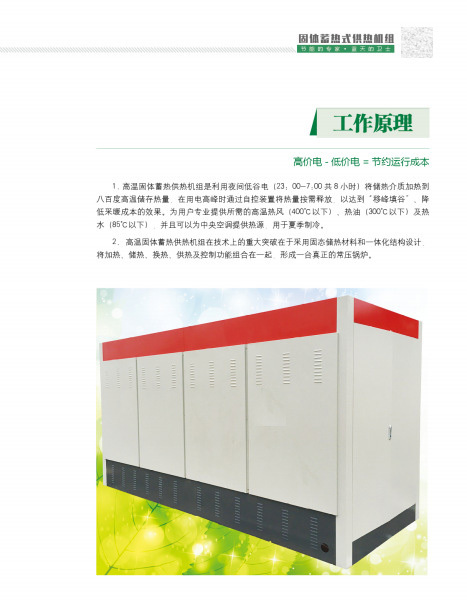 電加熱蓄能鍋爐,是在低谷電時段,采用夜間廉價的低谷電,或無法消納的風力發(fā)電、光伏發(fā)電等間歇性能源,將鍋爐本體內(nèi)部的固體合金或水加熱到一定溫度,使電能以熱能的形式儲存起來,并通過智能控制系統(tǒng),在指定的時段、以特定的溫度將熱能輸送給用熱單位。